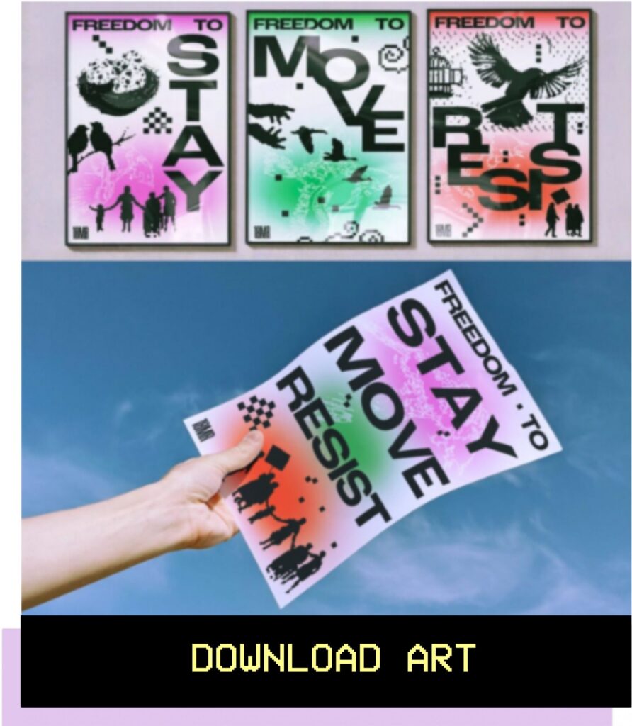 With our Freedom to Stay Move Resist campaign is the freedom to tell our stories and shape our futures. We are proud to continue following in the footsteps of artists, designers, and movement workers who came before us, who imbue global liberation struggles with visuals that bridge language and migrate across borders.
