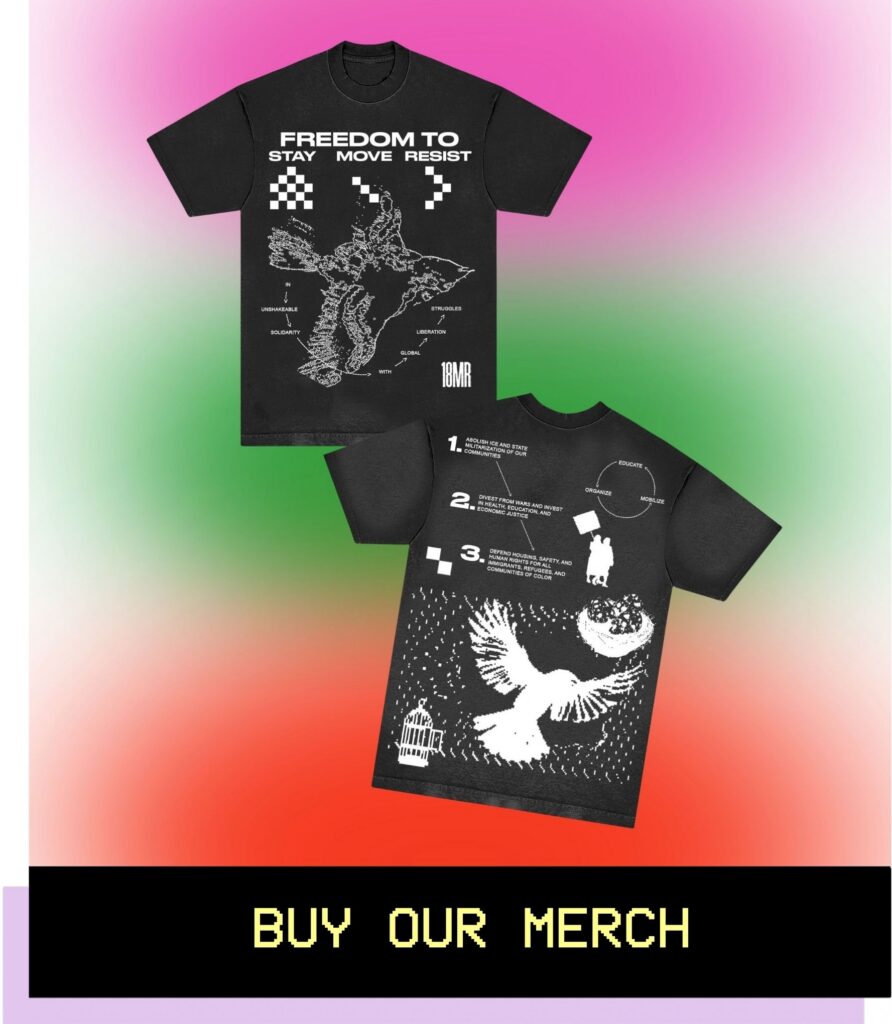 The campaign road ahead is long — we need your support to keep our fight sustainable! Your direct donation or merch purchase will support a wide range of campaign activities, including critical training and political education, membership support, political artwork, digital security tools, and emergent needs as we adapt to movement-wide changes in the fight for immigrant justice.